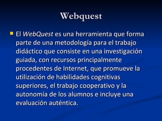 El documento describe la webquest, una herramienta educativa que guía a los estudiantes a través de una investigación en Internet. Explica que una webquest típicamente tiene una introducción, tareas, recursos en línea, procesos, conclusiones y que busca desarrollar habilidades de pensamiento superior en los estudiantes trabajando de forma individual o colaborativa.