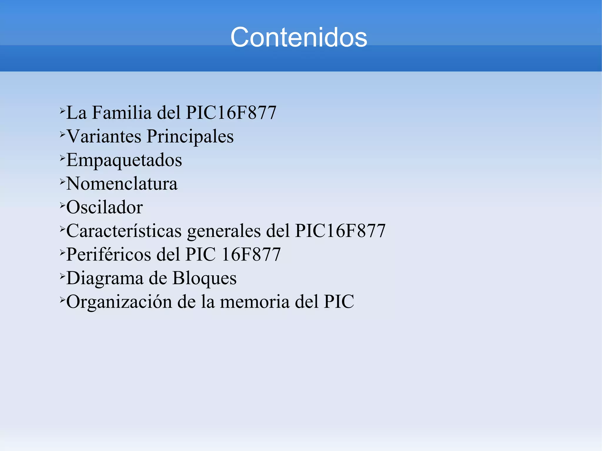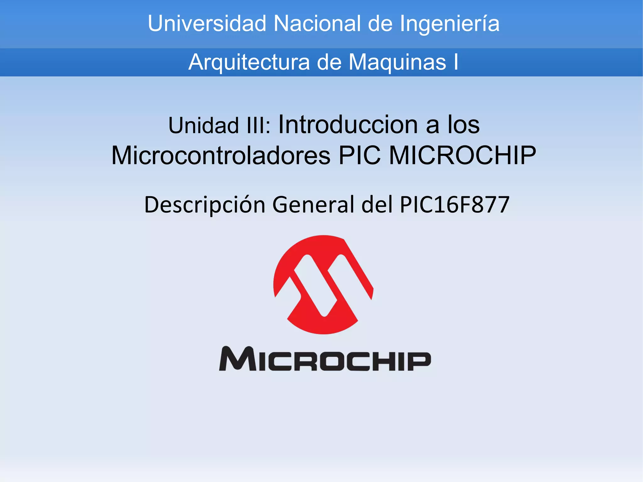 Este documento describe los microcontroladores PIC16F877 de Microchip. Explica que pertenecen a una familia de microcontroladores de 8 bits con arquitectura Harvard y tecnología RISC y CMOS. Detalla las características del PIC16F877 como su CPU de 35 instrucciones, hasta 8k de memoria flash, 368 bytes de RAM, oscilador con 8 modos y 14 fuentes de interrupción. También describe la organización de su memoria en programas y datos, y sus periféricos.