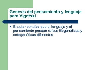 El documento resume las principales ideas de Vigotski sobre el desarrollo del lenguaje y el pensamiento. Según Vigotski, el lenguaje y el pensamiento tienen orígenes evolutivos diferentes, y en los humanos convergen en un momento de la ontogenia cuando el pensamiento adquiere una forma verbal. También explica que el lenguaje egocéntrico desempeña un papel importante como transición entre el habla social y el pensamiento verbal. Finalmente, discute las diferencias entre las posturas de Piaget y Vigotski sobre la función del lenguaje egocént