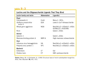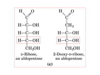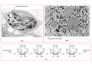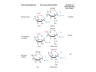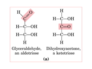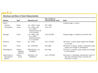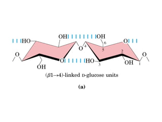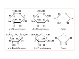 Los carbohidratos son biomoléculas abundantes que incluyen azúcares, almidón y polisacáridos. Pueden servir como combustible, estructuras de soporte o señales celulares. Existen monosacáridos como la glucosa, disacáridos formados por la unión de monosacáridos, y polisacáridos de cadenas largas. Algunos carbohidratos adoptan formas cíclicas y pueden presentar isomería anomérica. Los carbohidratos también se unen a proteínas y