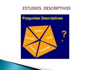 Los estudios descriptivos se limitan a informar sobre la distribución de las enfermedades en las poblaciones y constituyen una fase previa a los estudios analíticos. miden parámetros como prevalencia e incidencia sin establecer relaciones causales, pero sirven para generar hipótesis y conocer grupos vulnerables. Dentro de ellos se incluyen estudios transversales, de series de casos y prevalencia/incidencia que proporcionan información sobre la frecuencia y características de una enfermedad en un momento dado.