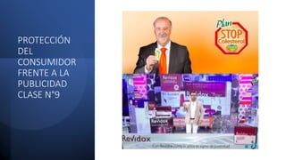 Este documento presenta la protección del consumidor frente a la publicidad en Perú. Explica que la publicidad comercial se rige por la Ley de Represión de la Competencia Desleal y otras normas específicas. La finalidad de esta protección es evitar publicidad engañosa que pueda inducir a error a los consumidores sobre los productos o servicios. También establece requisitos para la publicidad de promociones, sorteos y concursos, así como limitaciones a la publicidad dirigida a menores. Finalmente, indica que la Comisión de F