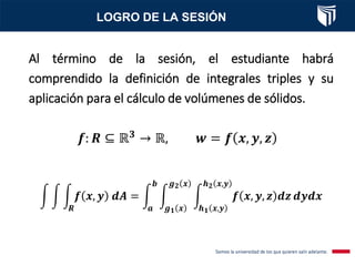 Este documento presenta el tema de integrales triples. Define las integrales triples como una extensión de las integrales dobles para funciones de tres variables, y explica cómo se calculan los volúmenes de sólidos utilizando esta herramienta. También cubre conceptos clave como la suma de Riemann, el teorema de Fubini y diferentes casos posibles para la evaluación de integrales triples. Finalmente, incluye un ejemplo resuelto.