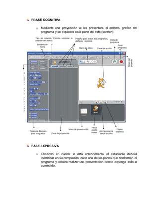 El documento describe una clase para estudiantes de 10o grado que tiene como objetivo familiarizar a los estudiantes con el entorno de trabajo del programa Scratch. La clase comenzará con una presentación que muestra y explica cada parte de la interfaz de Scratch, luego los estudiantes identificarán las mismas partes en sus propias computadoras y presentarán lo que han aprendido.