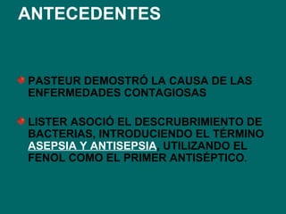 El documento describe varios métodos de esterilización empleados para destruir microorganismos, incluyendo el calor húmedo en autoclaves, calor seco en hornos, radiaciones como rayos gamma, óxido de etileno y glutaraldehído. También explica medidas de asepsia como lavado de manos y el uso de antisépticos como la clorhexidina y yodopovidona para inhibir el crecimiento bacteriano.