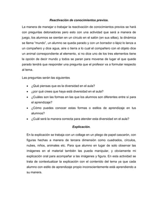 Este documento presenta el plan de una clase sobre el tema de "Aula Diversificada". La clase comenzará con una actividad lúdica para reactivar conocimientos previos de los estudiantes sobre diversidad. Luego, el maestro dará una explicación visual del tema usando figuras tridimensionales. Finalmente, los estudiantes participarán en un juego de crucigramas en equipos y luego harán una exposición grupal para evaluar su aprendizaje.