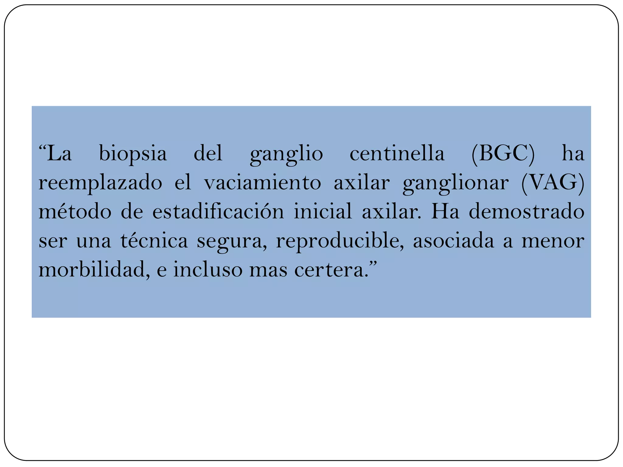 La biopsia del ganglio centinela ha reemplazado al vaciamiento axilar como método de estadificación axilar inicial, demostrando ser una técnica segura, reproducible y asociada a menor morbilidad. El ganglio centinela es el primer ganglio que recibe el drenaje linfático del tumor primario de mama, y su estudio permite predecir el estado de la axila con un valor cercano al 99%. La identificación del ganglio centinela durante la cirugía ocurre en el 92-98% de los casos mediante el uso de radioisótopos