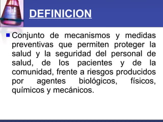 El documento presenta las normas de bioseguridad, incluyendo la definición, principios básicos como la universalidad y colocación de barreras protectoras, precauciones universales como el lavado de manos y uso de equipos de protección, clasificación y eliminación segura de desechos hospitalarios, y normas internacionales para la eliminación de basuras. También describe equipos de protección como mascarillas, guantes y batas, así como precauciones universales para trabajar de manera segura en laboratorios.
