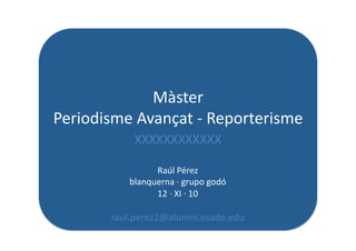 El documento presenta la biografía y experiencia profesional de Raúl Pérez. Además, introduce los objetivos de su presentación sobre estrategia competitiva para jóvenes periodistas en un nuevo escenario para los medios, analizando los determinantes competitivos del sector y las claves del cambio.