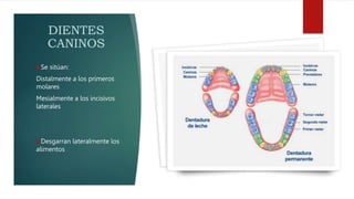Los caninos se sitúan entre los primeros molares y los incisivos laterales. Desgarran lateralmente los alimentos. Tienen una relación 1:1 con el canino opuesto y una relación 1:2 mesial y distal con los dientes adyacentes.