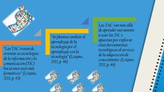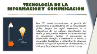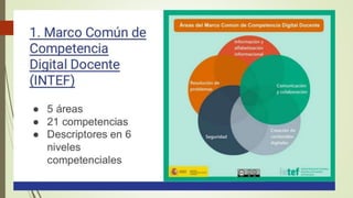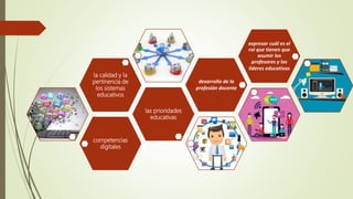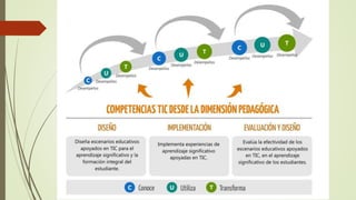 El documento describe las competencias digitales que deben poseer los docentes. Explica que las competencias digitales docentes implican el uso crítico y seguro de las tecnologías de la información para el trabajo y la comunicación, así como para apoyar la enseñanza y el aprendizaje de manera integrada. También presenta estándares internacionales sobre competencias digitales docentes propuestos por la UNESCO, los cuales incluyen ser usuarios competentes de tecnologías de la información, solucionadores de problemas, comunicadores y ciudadanos informados.