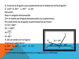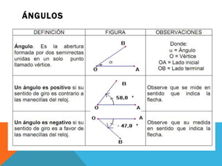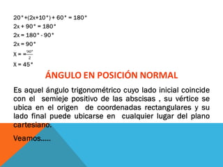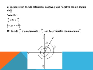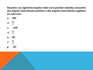 Este documento describe conceptos relacionados con ángulos como ángulos orientados, ángulos en posición normal y ángulos coterminales. Explica que los ángulos coterminales son ángulos en posición estándar que tienen el mismo lado terminal. Para encontrar ángulos coterminales de un ángulo dado, se suma o resta 360 grados o 2π radianes al ángulo. También presenta dos ejemplos resueltos de problemas relacionados con ángulos.
