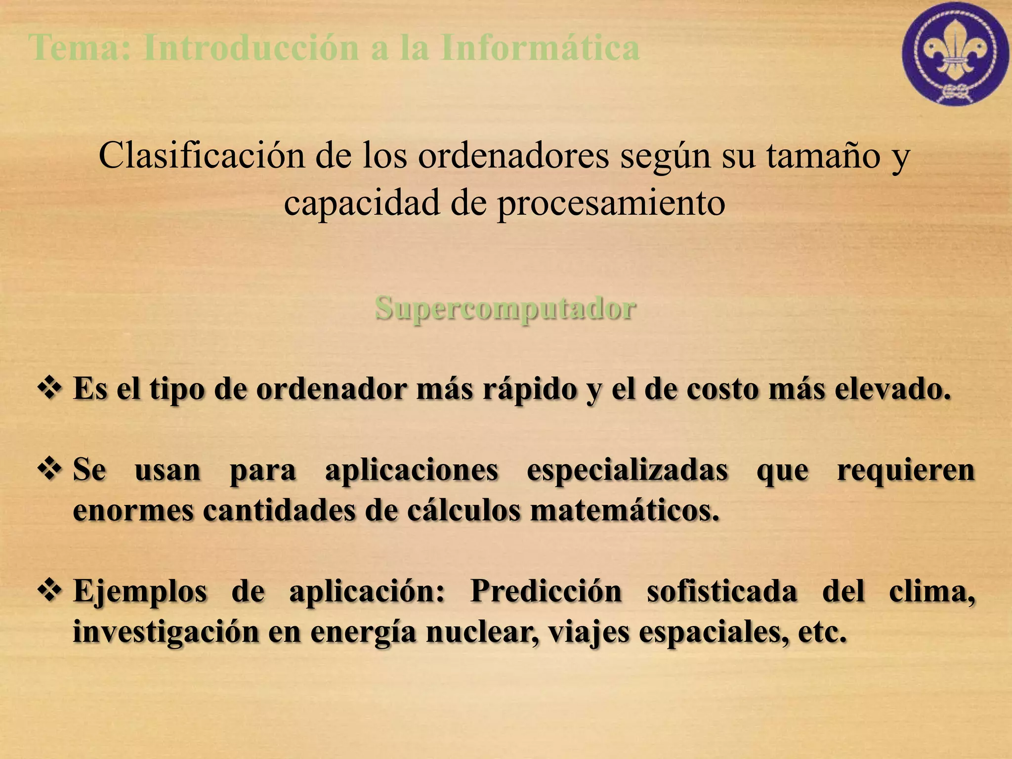 El documento proporciona una introducción a la informática y clasifica los ordenadores según su tamaño y capacidad de procesamiento, abordando categorías como supercomputadores, mainframes, minicomputadores, estaciones de trabajo y ordenadores personales. Además, define datos e información, explica sistemas de numeración (decimal, binario, octal y hexadecimal) y detalla unidades de medida para almacenamiento de datos, como bits y bytes. Finalmente, se discuten conceptos sobre cómo los datos se representan y procesan en los ordenadores.