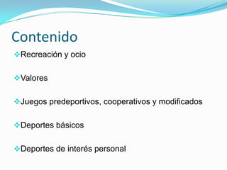 Este documento presenta información sobre la recreación, el ocio, los valores asociados con el juego y el deporte, y describe varios tipos de juegos y deportes como medio de recreación, incluyendo juegos predeportivos, cooperativos y modificados, así como deportes básicos como baloncesto, fútbol, voleibol, gimnasia, natación y atletismo. También distingue entre deportes individuales con y sin oposición.