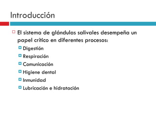 El documento detalla la anatomía y función de las glándulas salivales, clasificándolas en mayores y menores, y describe su desarrollo embrionario, irrigación y drenaje. También aborda diversas patologías asociadas, incluyendo parotiditis y sialoadenitis, así como enfermedades inflamatorias, granulomatosas y autoinmunes como el síndrome de Sjögren. Se proporciona información sobre síntomas, diagnóstico y tratamiento de estas condiciones.