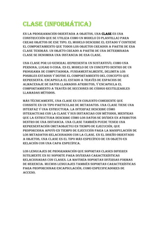 Una clase define el estado y comportamiento de un objeto, actuando como plantilla para crear instancias de objetos. Una clase representa un concepto como una persona o lugar, delimitando sus posibles estados y definiendo su comportamiento a través de atributos y métodos. Técnicamente, una clase consiste en metadatos que describen su interfaz y estructura, especificando cómo interactuar con la clase y sus instancias. Los lenguajes de programación soportan diferentes características de clases como herencia y encapsulamiento.