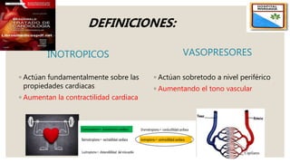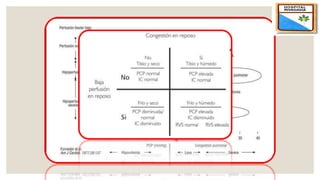 El documento describe el síndrome de bajo volumen minuto, que ocurre cuando el volumen minuto del corazón es inferior a 2 litros por minuto por metro cuadrado. Esto resulta en un flujo sanguíneo insuficiente que puede causar hipotensión, hipoperfusión periférica y acidosis metabólica. El documento explica las causas, diagnóstico y tratamiento del síndrome, incluyendo la optimización de la precarga, poscarga y el uso de inotrópicos y asistencia circulatoria mecánica si es neces