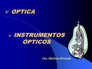 El documento describe las propiedades de la luz y los instrumentos ópticos. Explica que la luz tiene naturaleza ondulatoria y electromagnética y está constituida por fotones. Describe las propiedades de la reflexión, refracción y reflexión interna total. También explica cómo funcionan las lentes, el microscopio simple, compuesto y electrónico, y define conceptos como agudeza visual y sistema óptico del ojo.