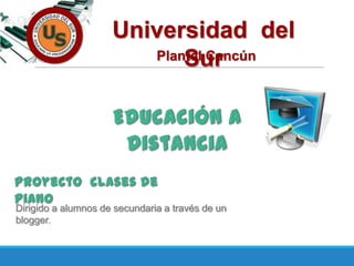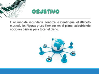 Este documento describe un programa en línea para enseñar nociones básicas de piano a estudiantes de secundaria a través de videos, materiales de lectura, diapositivas y comunicación a distancia. El programa utiliza un enfoque de aprendizaje basado en problemas donde los estudiantes toman responsabilidad por su propio aprendizaje. Los temas incluyen el alfabeto musical, figuras musicales, símbolos y silencios, evaluados a través de exámenes escritos y la presentación de un portafolio de evidencia.
