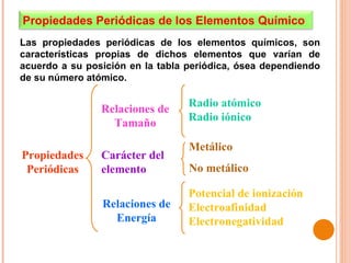 Este documento describe las principales propiedades periódicas de los elementos químicos, incluido cómo varían según la posición del elemento en la tabla periódica. Explica que las propiedades como el radio atómico, radio iónico, energía de ionización, afinidad electrónica y electronegatividad tienden a aumentar o disminuir de forma predecible a lo largo de los períodos y grupos, y cómo esto determina si un elemento se comporta como un metal o no metal.