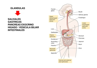 El documento describe las funciones secretoras del aparato digestivo. A lo largo del tracto gastrointestinal hay glándulas que secretan enzimas digestivas y moco para lubricar y proteger las paredes. Las principales glándulas son las salivales, gástricas, pancreáticas, hepáticas e intestinales. Estas glándulas secretan de forma coordinada gracias a estímulos nerviosos y hormonales para digerir y absorber los nutrientes de manera eficiente.