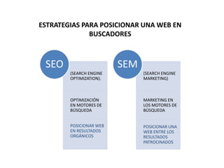 Este documento resume las principales estrategias para posicionar una página web en los buscadores, incluyendo optimización interna (SEO) como mejorar el contenido y estructura de la página, y optimización externa (link building) para obtener enlaces entrantes. También describe el marketing de motores de búsqueda (SEM) que permite posicionar anuncios pagos, con diferencias clave frente al SEO como costos, tiempos para resultados y medición de la eficiencia.