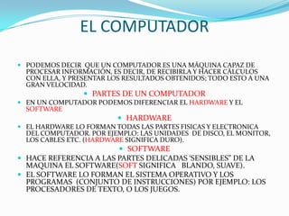 El documento describe los componentes principales de un computador. Explica que un computador está formado por hardware y software. El hardware incluye partes físicas como la caja, la placa base, la memoria RAM, el microprocesador y las fuentes de alimentación. El software incluye sistemas operativos y programas. También describe periféricos de entrada y salida como teclados, monitores e impresoras, y diferentes tipos de computadores como de escritorio, portátiles y de bolsillo.