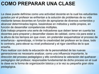 El documento presenta pautas para la preparación y desarrollo de clases efectivas, sugiriendo la importancia de definir objetivos claros y diseñar materiales pertinentes. Además, aboga por métodos pedagógicos que fomenten la participación y evaluación continua de los estudiantes, para potenciar su aprendizaje. Se enfatiza la necesidad de una atmósfera de respeto y motivación, así como la incorporación de contenidos relevantes y actualizados al proceso educativo.