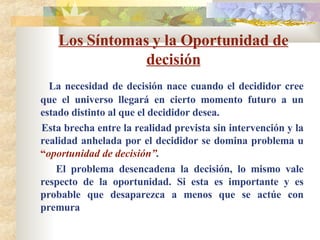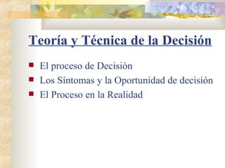 El documento aborda la teoría y técnica de la toma de decisiones, destacando el proceso decisivo como una serie de etapas que incluyen la identificación de un problema, la evaluación y selección de alternativas basadas en un análisis de la situación actual y futura. Se enfatiza que el proceso es desencadenado por la percepción de una brecha entre el estado actual y el deseado, así como la importancia de la voluntad de influir en el resultado. Además, se menciona que no todas las decisiones siguen un proceso ideal y que a menudo las restricciones temporales y contextuales pueden alterar este proceso.