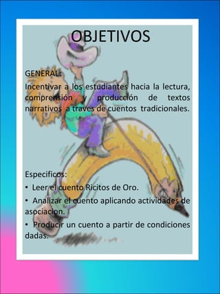 Este documento presenta un plan de lección para enseñar el cuento tradicional "Ricitos de Oro" a estudiantes. El plan incluye leer y analizar el cuento original, realizar actividades interactivas en línea relacionadas con el cuento, y luego crear un cuento nuevo con una cueva, Ricitos de Oro, un dragón y un enano como personajes dados. El objetivo es motivar a los estudiantes hacia la lectura, comprensión y producción de textos narrativos a través de cuentos tradicionales.