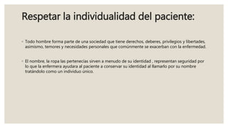 El resumen describe los principios básicos de la atención de enfermería, incluyendo respetar la individualidad del paciente, mantener las funciones fisiológicas normales, proteger al paciente de causas externas que puedan causar enfermedad, y ayudar a la rehabilitación del paciente. Los objetivos básicos de enfermería son promover la salud, prevenir la enfermedad, restaurar la salud y aliviar el sufrimiento.