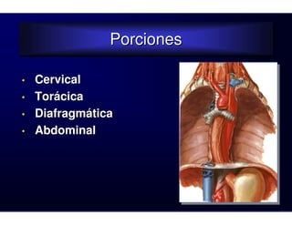 El esófago es un órgano muscular que conecta la faringe con el estómago. Está dividido en porciones cervical, torácica, diafragmática y abdominal. Presenta estrechamientos en las zonas cricoidea, aórtica, bronquial y diafragmática. Está irrigado por las arterias tiroidea inferior, bronquiales, aorta e intercostales, y drena hacia los plexos venosos submucoso y periesofágico que conducen a los troncos venosos del cuello, tórax