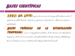 El documento describe la fundamentación histórica de la estimulación temprana. Explica que en las décadas de 1950 y 1960 se desarrollaron programas de intervención para niños con discapacidades, haciendo énfasis en aspectos físicos. Más adelante se incorporaron otras áreas como la percepción, comunicación y socialización. También se reconoció la importancia de trabajar con la familia. En la actualidad, la estimulación temprana se centra en satisfacer las necesidades individuales de cada niño en áreas como el desarrollo motor, len