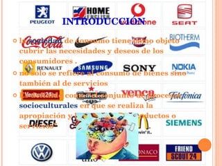 Este documento trata sobre la sociedad de consumo. Define la sociedad de consumo como el conjunto de procesos socioculturales en que se realiza la apropiación y uso de productos y servicios. Describe las características de la sociedad de consumo como la afluencia, el poder del consumidor y la psicología del consumidor. También analiza factores como la publicidad y la tecnología que influyen en el consumo.