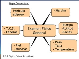 El documento describe la historia y evolución del examen físico desde la antigüedad hasta la actualidad. Explica que actualmente el examen físico completo consta de tres partes: examen general, examen regional y examen por sistemas. Luego procede a detallar los componentes del examen físico general como marcha, biotipo, actitud, facies, talla, peso y temperatura.