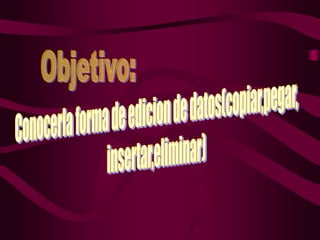 Este documento describe las funciones básicas de una hoja de cálculo de Excel. Excel permite procesar y representar datos numéricos mediante fórmulas y gráficos. Una hoja de cálculo contiene celdas organizadas en filas y columnas que pueden usarse para realizar cálculos, análisis de datos y automatizar procesos. El documento explica conceptos como libros, etiquetas, datos, inserción y eliminación de celdas, filas y columnas, y edición básica de datos.