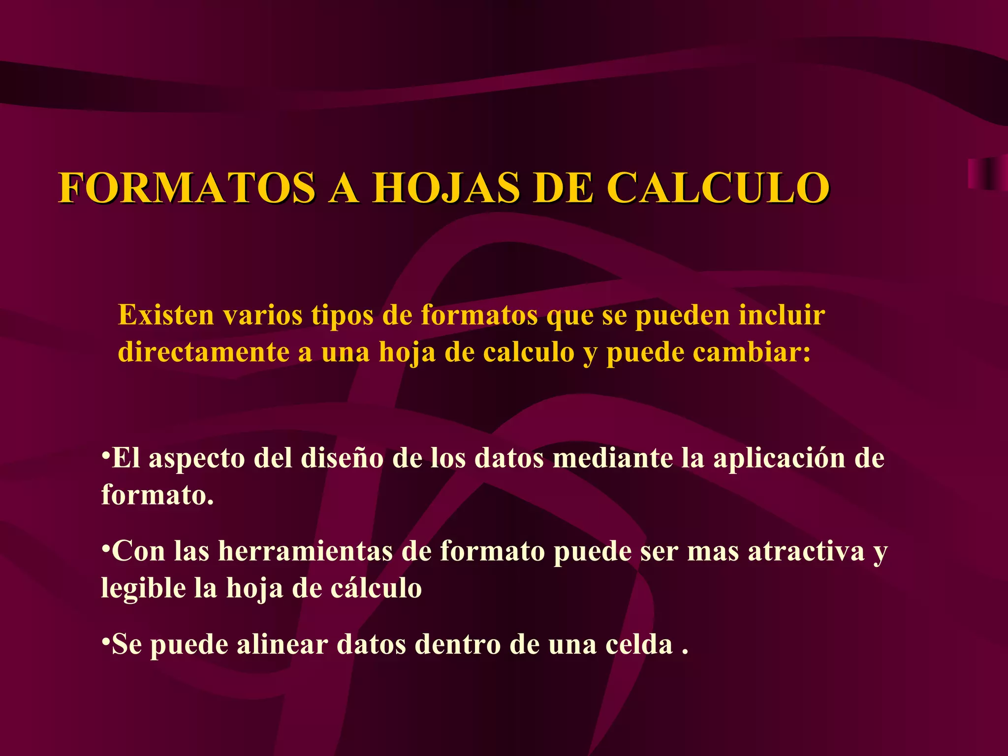 Los formatos de hoja de cálculo pueden cambiar el aspecto y legibilidad de los datos mediante la aplicación de formato a números, textos y celdas. Se pueden copiar formatos de una celda a otras para mantener un estilo consistente. Las fórmulas calculan valores usando operadores aritméticos, de comparación y de referencia a celdas, y pueden generar errores si los argumentos son inválidos.