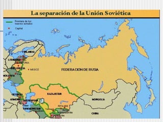 El documento describe la evolución de la Guerra Fría desde su inicio hasta su final. Se establecieron dos bloques antagónicos liderados por Estados Unidos y la Unión Soviética, generando una época de gran tensión. La Guerra Fría terminó con el colapso de la Unión Soviética y la caída del muro de Berlín, dando paso a una etapa de mayor cooperación entre las potencias.
