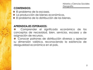 Este documento discute tres temas principales: 1) El problema de la escasez y cómo se producen los bienes y servicios utilizando factores productivos como la tierra, el trabajo y el capital. 2) La desigualdad económica en Chile y cómo se mide la pobreza. 3) El problema de la distribución de los bienes y la gran desigualdad que existe tanto entre países como dentro de los países.