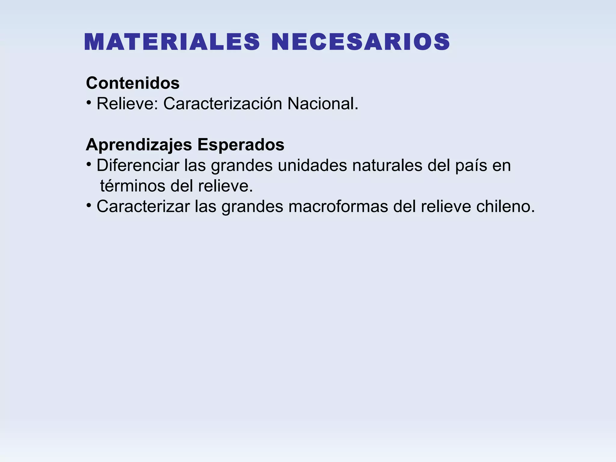 El documento describe las principales características del relieve de Chile. Se divide el país en cinco grandes regiones geográficas según su relieve: el Norte Grande, el Norte Chico, la Zona Central, la Zona Sur y la Zona Austral. Cada región se caracteriza por la presencia de diferentes unidades de relieve como la Cordillera de los Andes, la Cordillera de la Costa, las planicies litorales, la depresión intermedia y los campos de hielo.