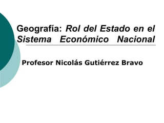 El documento discute el rol del Estado en el sistema económico nacional chileno. Explica que el Estado juega un papel fundamental en generar equilibrio a través de herramientas como la regulación, el gasto público, los impuestos y la gestión de empresas públicas. También interviene en tiempos de crisis económica a través de medidas estabilizadoras. Finalmente, cubre otros temas como la política fiscal, monetaria y presupuestaria del Estado y los organismos que las regulan.