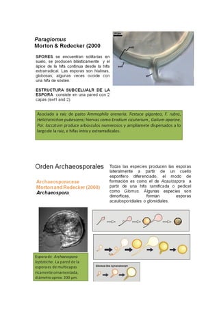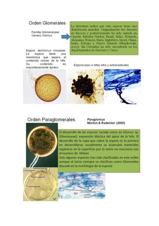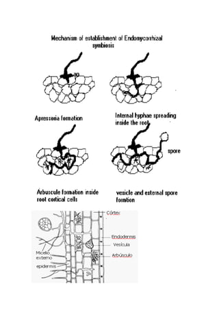 Las micorrizas arbusculares son simbiontes obligados que forman una relación mutualista con las raíces de las plantas. Poseen esporas asexuales grandes y un micelio cenocítico. Colonizan las raíces formando arbúsculos, vesículas e hifas que permiten el intercambio de nutrientes con la planta hospedera. Proporcionan numerosos beneficios a las plantas como mejor absorción de nutrientes y tolerancia al estrés.