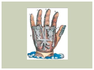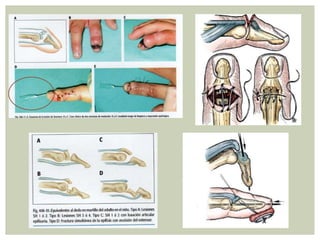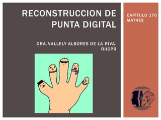 Este documento resume los principales aspectos de la reconstrucción de dedos de la mano tras lesiones. Describe la anatomía de la mano, las causas comunes de lesiones, la clasificación de lesiones y opciones de tratamiento como sutura, cierre secundario, injertos y diferentes tipos de colgajos locales e islas para la cobertura de defectos. El objetivo es proporcionar una reconstrucción funcional y estética de la mano tras una lesión.