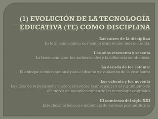 El documento trata sobre la tecnología educativa. En los años 1950 y 1960, los psicólogos y educadores desarrollaron programas de enseñanza basados en objetivos precisos y medición de resultados a través de pruebas. Fue durante esta época cuando la tecnología educativa cobró auge, celebrándose conferencias y publicándose revistas especializadas. Sin embargo, también hubo cuestionamientos sobre su enfoque estandarizado y su falta de consideración de las culturas pedagógicas de los profesores.