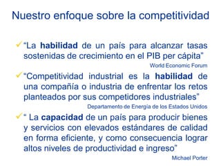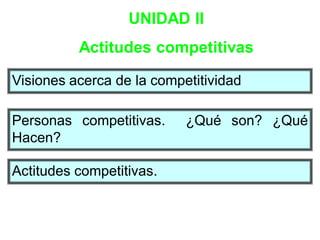 Este documento presenta conceptos sobre la competitividad a nivel personal, de organizaciones y países. Define la competitividad como la capacidad de competir con éxito logrando objetivos de manera eficiente. Explica que personas competitivas hacen organizaciones competitivas, las cuales fomentan la competitividad de sus integrantes. Finalmente, identifica características de personas competitivas como iniciativa, responsabilidad y persistencia.