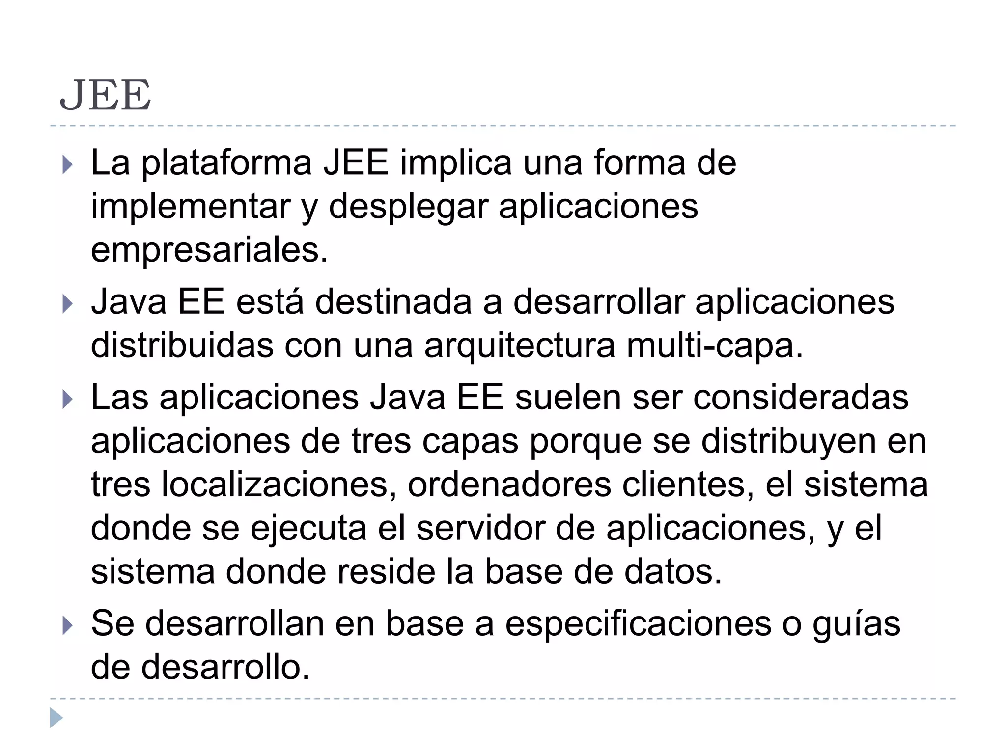 Este documento describe la plataforma Java EE y su arquitectura de aplicaciones multicapa. Java EE se utiliza para desarrollar aplicaciones empresariales distribuidas que suelen tener tres capas: cliente, web y negocio. La arquitectura Java EE contempla cuatro capas principales: cliente, web, negocio y sistemas de información empresarial. Cada capa se compone de diferentes componentes como servlets, EJB y aplicaciones cliente.