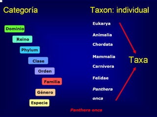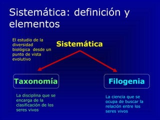 El documento describe los conceptos fundamentales de la sistemática biológica, incluyendo la filogenia, taxonomía y sus elementos. Explica que la filogenia se refiere al estudio de la historia evolutiva de un grupo basada en ascendencia común, mientras que la taxonomía es la clasificación de organismos vivos. También presenta los diferentes tipos de grupos filogenéticos como monofiléticos, parafiléticos y polifiléticos.