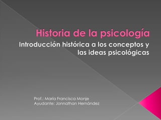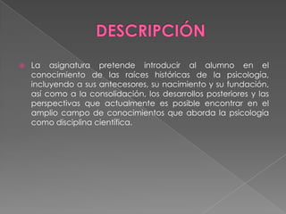 Este documento presenta un resumen de la asignatura "Historia de la psicología", la cual introduce a los estudiantes en las raíces históricas de la psicología desde sus orígenes filosóficos hasta su consolidación como disciplina científica. El documento describe los objetivos, contenidos, formas de evaluación y bibliografía de la asignatura, además de realizar una breve revisión de los principales conceptos y figuras desde la antigüedad que contribuyeron al desarrollo de la psicología.