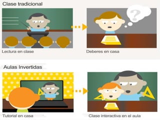 El modelo de 'clase invertida' o 'flipped classroom' permite a los estudiantes estudiar contenidos en casa mediante recursos audiovisuales y aplicar lo aprendido en clase bajo la guía del profesor. Esta metodología mejora la relación entre profesores y alumnos, fomenta un ambiente colaborativo y responsabiliza a los estudiantes de su propio aprendizaje, aunque presenta desventajas como la necesidad de un acceso adecuado a internet y la preparación del material. Se han implementado exitosamente en diversas instituciones educativas, observándose mejoras en la participación y el compromiso de los estudiantes.