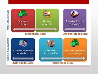 El modelo de aula invertida transfiere el aprendizaje teórico fuera del aula, permitiendo utilizar el tiempo de clase para ejercicios y resolución de dudas con la ayuda del docente. Este enfoque potencia la atención a la diversidad y fomenta el aprendizaje colaborativo, aunque también presenta desafíos como la brecha digital y la carga de trabajo para estudiantes y profesores. Ejemplos de herramientas utilizadas en este modelo incluyen Padlet y ClassOnLive.